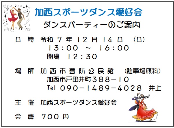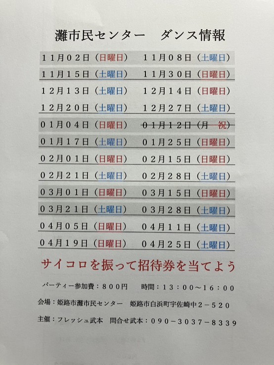 11月23日(日曜日)13:00〜15:30 西播磨文化会館新宮町宮内 生演奏で、踊ろう 山田敏行&ニューサウンド 会費:1000円